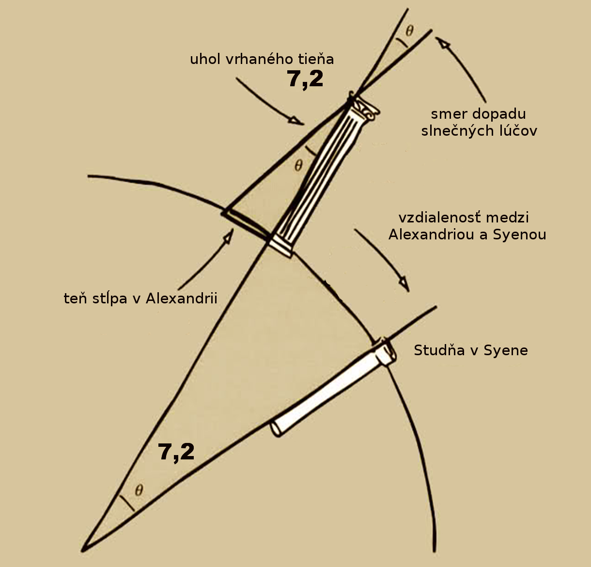 Ilustrácia merania tieňa gnomónom Schéma Eratosthenovho experimentu s uhlom tieňa.