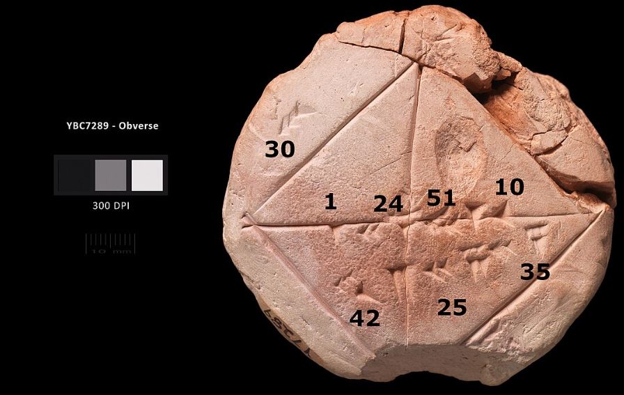 Babylonská tabuľka YBC 7289 - tabuľka s výpočtom odmocniny z dvoch, dôkaz pokročilej babylonskej algebry.